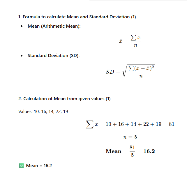 1. Write down the formula to calculate Mean and Standard Deviation. (1)
